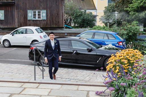 An einem spätsommerlich frischen Morgen traf ich somit bei leichtem Sonnenschein am Standesamt in Schliersee ein. Kurz nach mir kam dann auch schon Bräutigam Walther in einer schicken schwarzen Limousine angefahren und wartete nervös auf seine Braut Katharina, die wiederum einige Minuten später frisch gestylt und in einem wunderschönen, fließenden Kleid mit Spitzenoberteil am Standesamt erschien. Der First Look war ein voller Erfolg und beide offensichtlich sehr glücklich darüber, dass der große Tag endlich gekommen war.