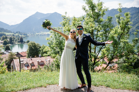 Zwischen Vorspeise und Hauptgang haben wir uns dann für kurze Zeit weg geschlichen, um die Hochzeitsbilder unter Dach und Fach zu bringen – wer wusste schließlich schon, wie lange das Wetter noch so gut sein würde? Fußläufig vom Standesamt und Ratskeller in wenigen Minuten zu erreichen befindet sich ein herrlicher Aussichtspunkt mit großartigem Blick über den Schliersee und die umliegende südbayerische Berglandschaft. Unter Fotografen sicherlich kein Geheimtipp, aber wen wundert es?