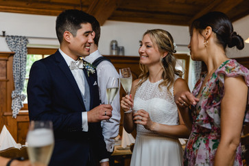 Die Trauung von Katharina und Walther fand im wunderschönen historischen Trausaal der Gemeinde Schliersee im ganz kleinen Kreis statt – nur die engsten Freunde und Familienangehörigen waren mit dabei. An großen Gefühlen mangelte es jedoch nicht, und so wurde viel gelacht, aber auch das ein oder andere Tränchen der Rührung verdrückt. Nach etwa zwanzig Minuten war die Zeremonie vorbei, sämtliche Formalitäten waren erledigt und man konnte sich dem gemütlichen Teil des Tages widmen. Zunächst wollten die Gäste dem frisch gebackenen Hochzeitspaar natürlich gratulieren.
