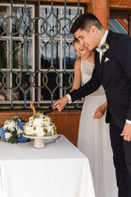 Ihre Freunde überraschten Katharina und Walther mit liebevollen Aufmerksamkeiten: Eine gute Freundin des Paars hatte eine kleine, kunstvoll dekorierte Hochzeitstorte gebacken, die auch gleich angeschnitten wurde – ist sie nicht ein Augenschmaus? Und nicht nur das, auch der Geschmack war grandios. Danach mussten sich Katharina und Walther noch einer kleinen Aufgabe stellen, die sie mit Bravour meisterten, bevor es schließlich zur Feier in den direkt benachbarten Ratskeller ging.