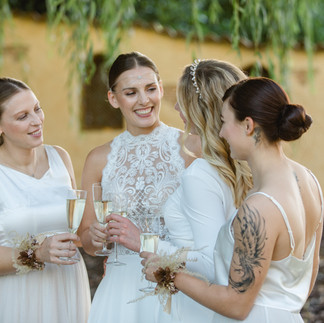 Auch die Details wie Hochzeitskleid, Brautstrauß, Schuhe oder sonstige Accessoires rücken nun in den Fokus. Lara trägt hier ein zartes cremefarbenes Kleid mit spitzenbesetztem Oberteil und fließendem Rock, Jule hat sich für einen modernen Jumpsuit mit aufregendem Rückenausschnitt entschieden.